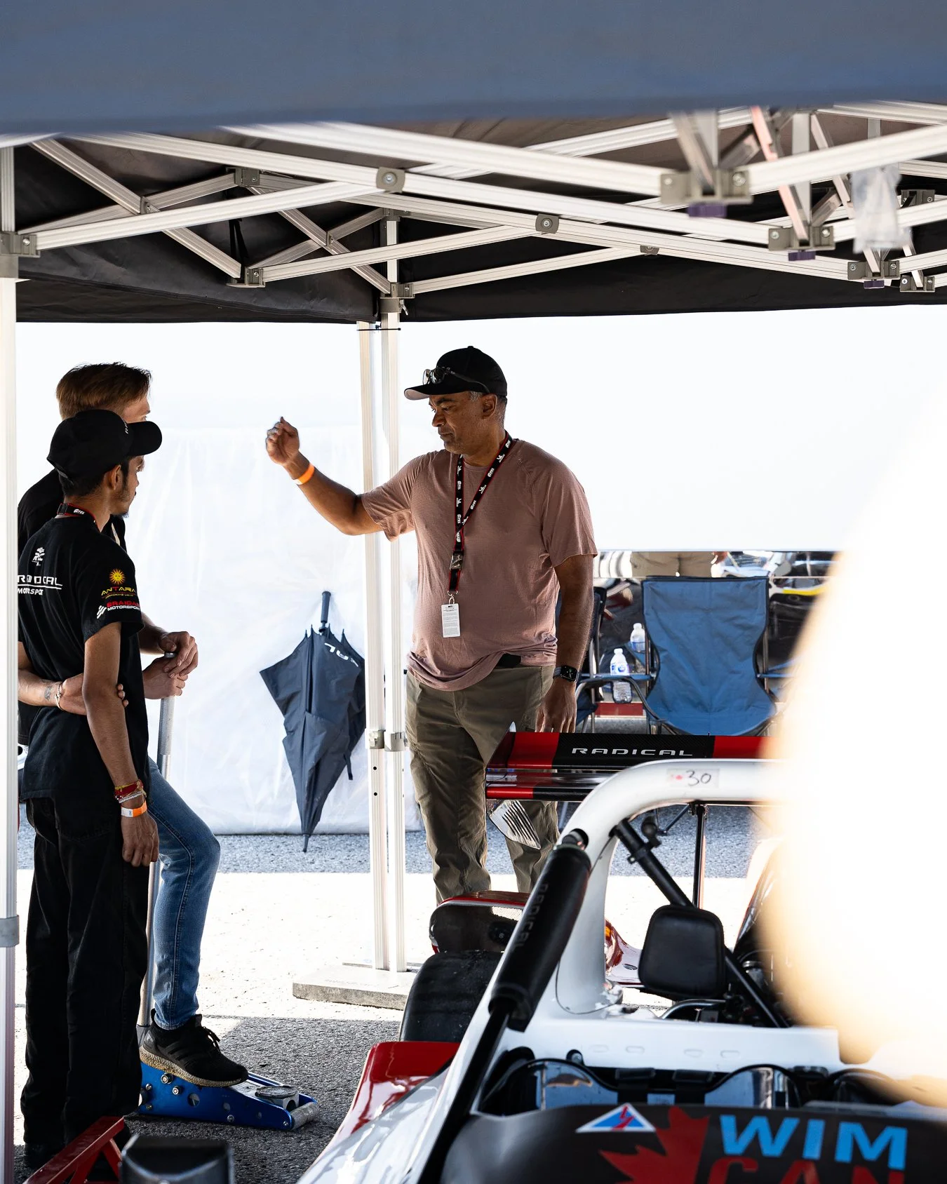 Three men are standing under a canopy tent, having a conversation at a racing event. One man is gesturing with his hand while the other two listen. A race car and a blue umbrella are visible nearby.