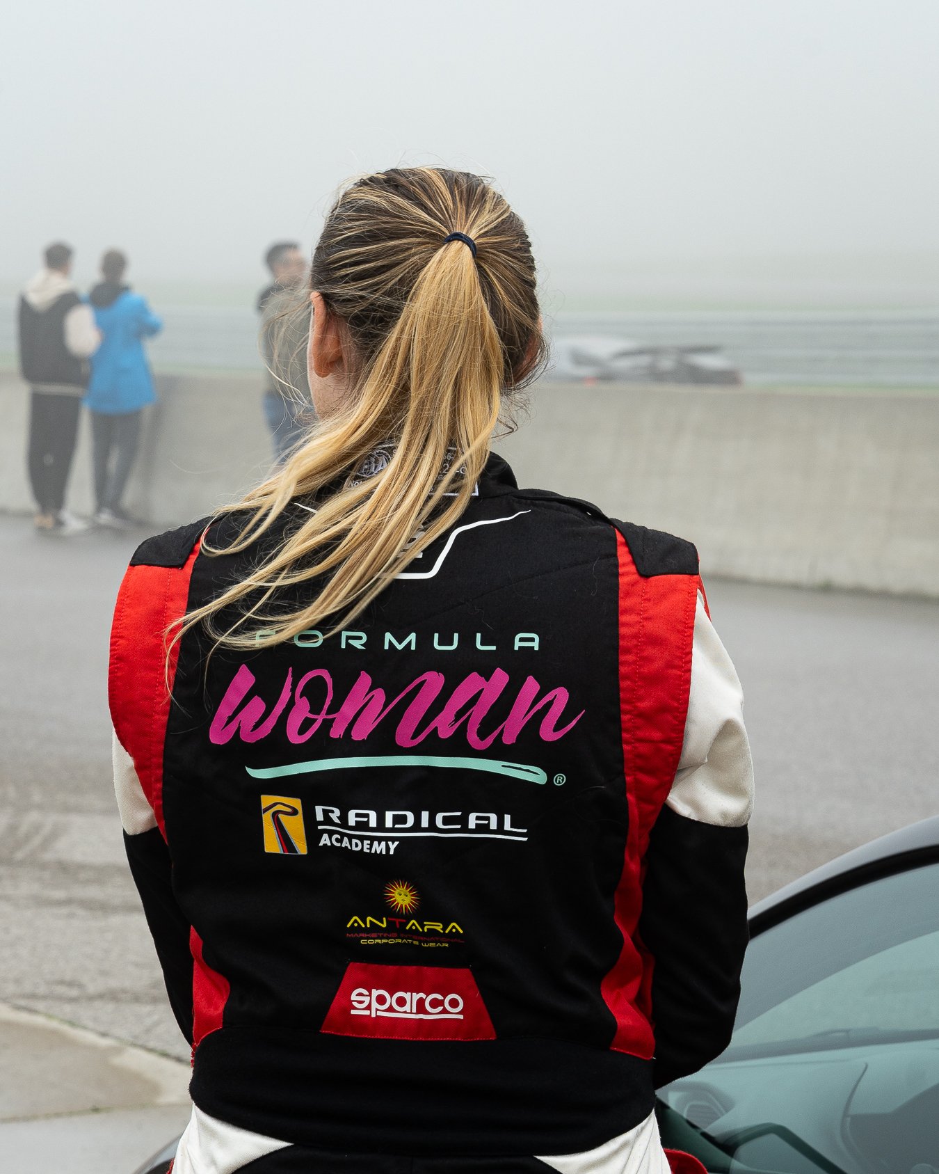 A woman in racing gear laughing as she exits a black sports car on a foggy race track.